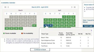 The current and upcoming month are displayed with clear demarcation of room availability – green for room available, red for – no vacancy and blue signifies current date selection. The guest will be able to view the room type and number of rooms available for a day by clicking on a date. For example, if you only have 2 standard rooms available for 14th February, guests seeking to make a room booking for this date will see the same when they run the mouse over the desired arrival date.